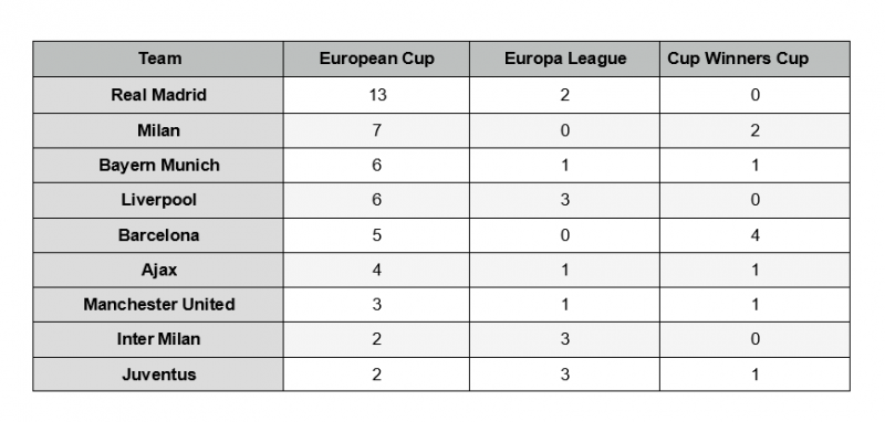 Ajax have won the European Cup/Champions League four times, and are one of three clubs that have won the competition three times consecutively. Ajax have also won the UEFA Cup Winners’ Cup once.