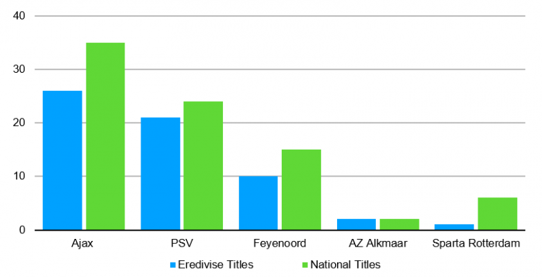 Lets now take a look at how by building on this basic concept Ajax have become a European force over the last 50 years. Ajax has dominated the Dutch top-tier Eredivisie division, being crowned champions 34 times.
